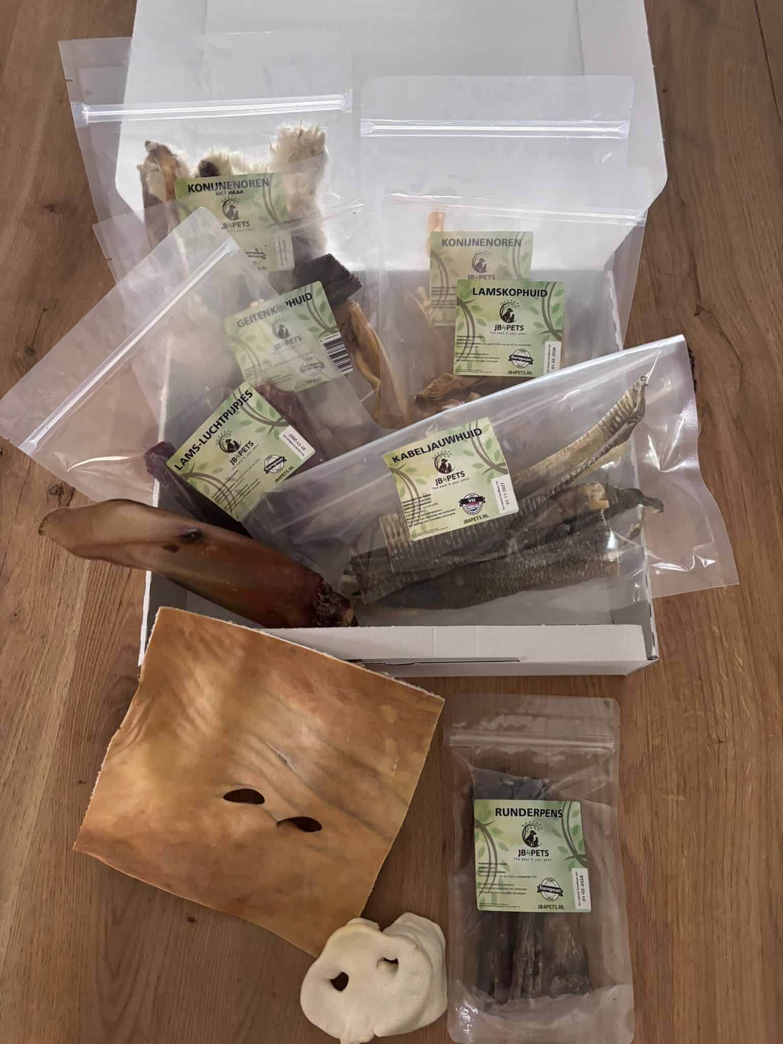 Een box gevuld met stevige, natuurlijke kauwproducten die pups echt bezighouden.