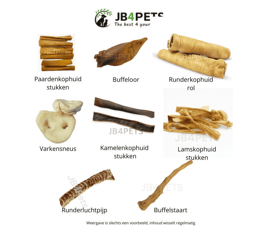 9 Verschillende items zoals: Buffeloor,Buffelstaart Paardenkophuid, Runderkophuid rol, Kamelenkophuid, runderluchtpijp, Varkensneus, Lamskophuid. In elke box zit ook een rolletje biologisch afbreekbare poepzakjes van Margot-Mollie.